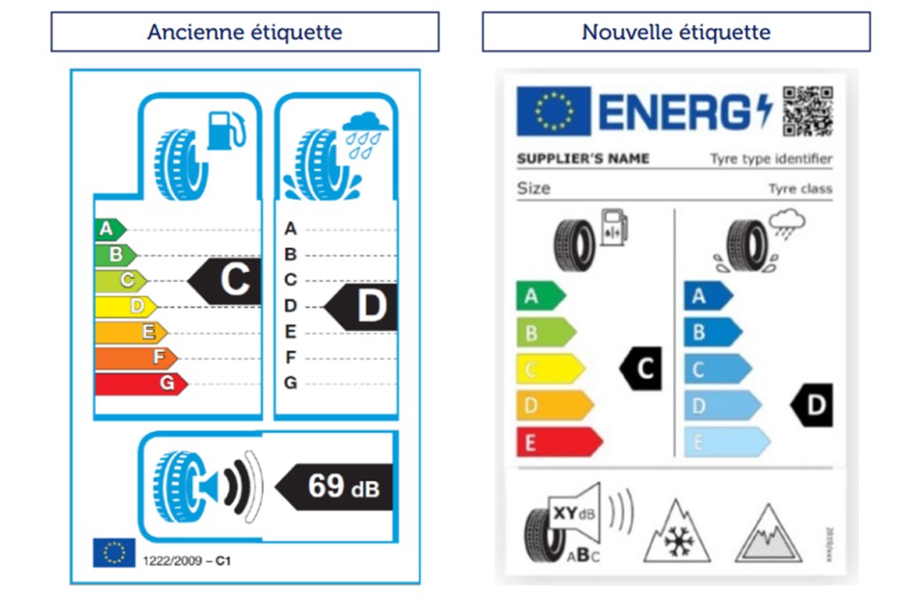 Sur la partie supérieure, le nom commercial du fournisseur, la référence de type de pneu et les dimensions, indices de charges et de vitesse ainsi que la classe seront désormais mentionnés. Les classes d’efficacité d’adhérence sur sol mouillé et d’efficacité en carburant qui figuraient sur l’ancienne version demeurent. La nouvelle version voit la notation en nombre d’ondes pour le critère bruit remplacée par une note A,B ou C tout en conservant la valeur en décibels. Les informations d’adhérence sur neige ou verglas font leur apparition sous forme de pictogramme (3PMSF ou glace). Enfin, un QR code sera imprimé sur la partie supérieure de l’étiquette et renverra sur la fiche d’information.